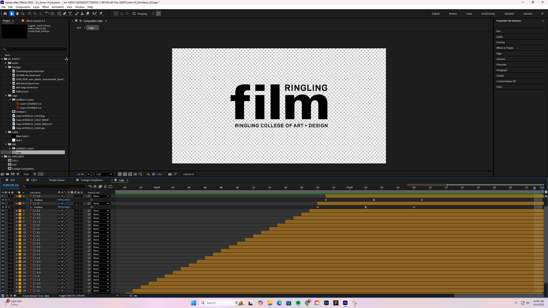 For the logo, I masked out each individual letter in "Ringling College of Art + Design" and animated the position changes. I adjusted the eases all together to keep it consistent. Then, I offset each letter by two frames to make it more fun.